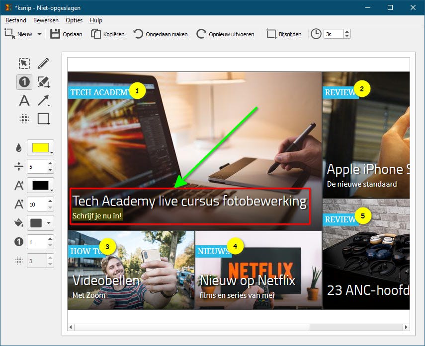Heb je af en toe een afbeelding zonder franje nodig van je scherm, een programmavenster of een zelf af te bakenen gebied, dan heb je Ksnip niet nodig. Maar dat verandert snel als je allerlei aantekeningen aan je schermafbeelding wilt toevoegen, zoals tekst, pijlen, kaders of nummers. Wanneer je Ksnip opstart duikt een miniatuurvenster op van waaruit je een nieuwe schermafbeelding kunt maken. Of je roept de tool vanuit het systeemvak van Windows op met een (instelbare) sneltoets. Ksnip biedt vijf screenshot-modi aan, al dan niet na een instelbare wachttijd: een rechthoekig gebied, het vorige rechthoekige gebied (handig als je snel een nieuwe schermafbeelding van hetzelfde gebied wilt maken), het huidige scherm, alle schermen in één keer en het actieve programmavenster. Geen optie dus om een tekstdeel met de vrije hand te selecteren.