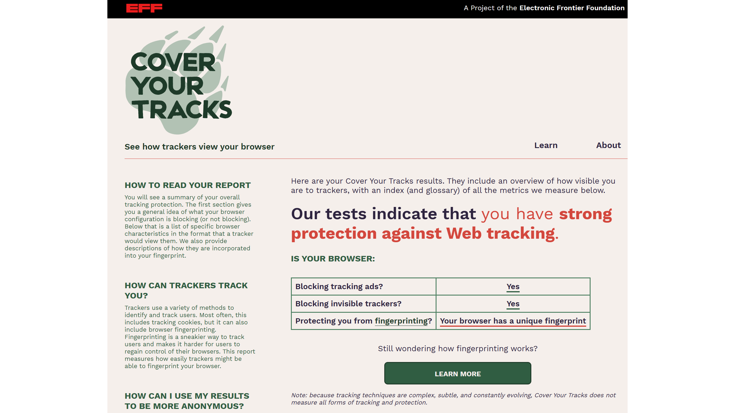 Ben je benieuwd in hoeverre je momenteel informatie prijsgeeft? Op https://coveryourtracks.eff.org vind je een gratis test die je meer inzicht geeft. Klik op Test your browser. De pagina geeft vervolgens aan welke informatie voor derden zichtbaar is en in hoeverre er al maatregelen zijn genomen. Een populaire methode om je als gebruiker online te volgen, is het gebruik van ‘fingerprinting’. Hierbij verzamelt de tracker een set van uiteenlopende kenmerken. Bijvoorbeeld welke systeemlettertypen zijn geïnstalleerd, welke schermresolutie en hardwareconfiguratie je systeem gebruikt en welke plug-ins je hebt geïnstalleerd. Die combinatie is ‘uniek’ voor de gebruiker. Op basis hiervan kun je vervolgens worden gevolgd.