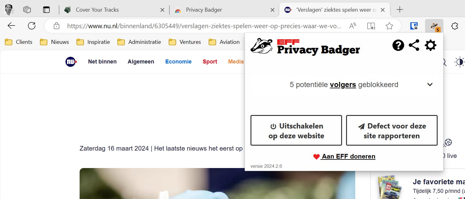 Helaas is er nog geen waterdichte bescherming tegen fingerprinting beschikbaar; daar wordt wel continu aan gewerkt, bijvoorbeeld door Privacy Badger. Deze browseruitbreiding helpt je te beschermen tegen trackers en een deel van de fingerprinting-methoden. De plug-in is onder meer beschikbaar voor Chrome en Firefox.