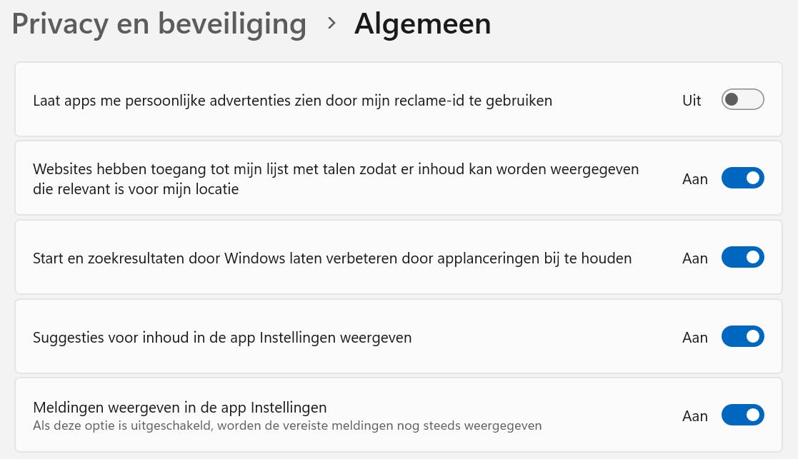 Open in het instellingenvenster vervolgens Algemeen en zet de schuif op Uit bij Websites hebben toegang met mijn lijst met talen zodat er inhoud kan worden weergegeven die relevant is voor mijn locatie, Laat apps me persoonlijke advertenties zien door mijn reclame-id te gebruiken en Start en zoekresultaten door Windows laten verbeteren door applanceringen bij te houden.