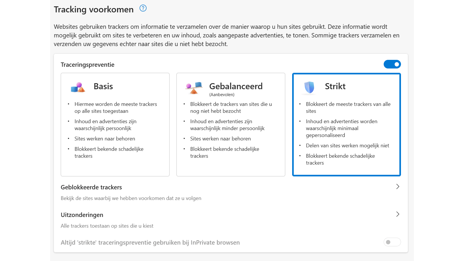 Eerlijk is eerlijk: de ingebouwde browser van Windows besteedt steeds meer aandacht aan privacy. Het is wel belangrijk dat je instellingen op de juiste manier configureert: standaard zijn ze veel te vrij afgesteld. Druk in Edge op Alt+F en kies Privacy, zoeken en services. Edge bevat een ingebouwde blokkering tegen tracking. Zet de schuif op Aan bij Traceringspreventie en bepaal hoe streng de blokkering moet zijn. Je kiest daarbij tussen Basis, Gebalanceerd en Strikt. Onder elke modus lees je wat deze inhoudt. Wij kiezen voor Strikt. In de praktijk werkt het merendeel van de websites prima met dit niveau. Websites die in deze modus weigeren te werken en die je alsnog wilt bezoeken, kun je toevoegen aan de lijst met uitzonderingen. Op deze websites worden trackers alsnog toegestaan. Klik op Uitzonderingen en voeg de website toe.