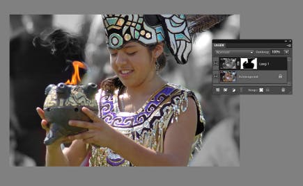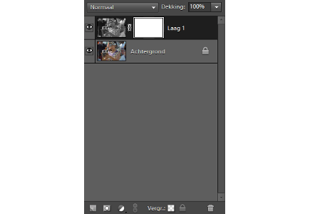 Een laagmasker gebruikt u om bepaalde delen van een laag te verbergen en andere delen te tonen. De bovenste laag is in het palet Lagen nog steeds actief. Onderaan dit palet vindt u de nieuwe knop Laagmasker toevoegen. De knop is een rechthoekje met een cirkeltje in het midden. Als u daar op klikt, verschijnt er in het palet Lagen een wit vlakje naast het miniatuur van de bovenste laag. Op dit ogenblik is het laagmasker volledig wit, dat betekent dat alles van deze laag wordt getoond. Met andere woorden u krijgt het volledige zwart-witplaatje van de bovenste laag te zien. Vanaf nu kunt u het laagmasker handmatig aanpassen tot in de kleinste details met twee kleuren: zwart en wit. Onthoud: zwart bedekt en wit onthult, of gebruik het Engels ezelsbruggetje: 'black conceils, white reveals'. Zorg dat de kleurkiezer dus op zijn standaardinstelling staat: voorgrondkeur zwart en achtergrondkleur wit.