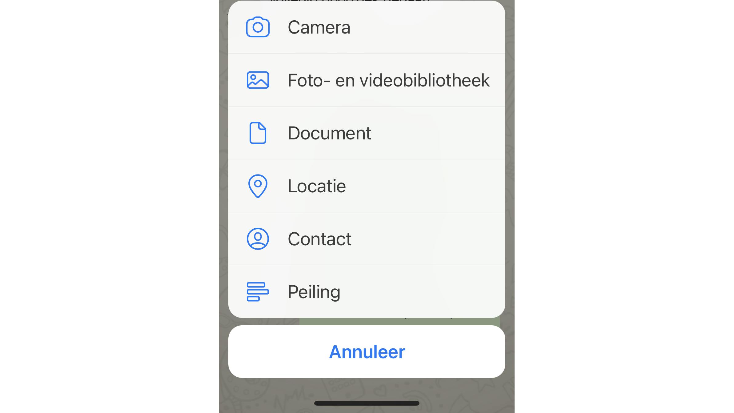 De nieuwe functie werkt alleen in de mobiele versie van WhatsApp, niet in de web- of de desktopversie. Bovendien moet je over de nieuwste versie van de app beschikken. Je kunt een poll plaatsen in een één-op-één-chat, maar deze optie is het handigste in een groeps-chat. Open in WhatsApp de chat van de groep die je wilt aanspreken. Daarna tik je in iOS op het plusteken of in Android op het paperclipje. Je vindt deze pictogrammen naast of in het vakje waarin je berichtjes typt. Kies onderaan de optie Peiling.