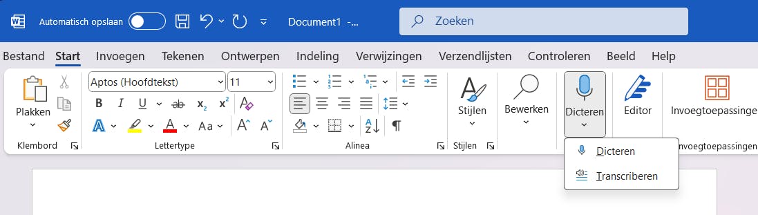 De opdracht Transcriberen staat onder de knop Dicteren.