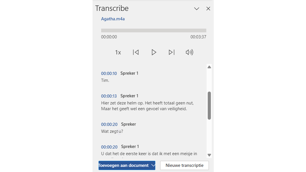 Transcriberen lukt ook met een bestaand audiobestand. Voor de gelegenheid hebben we een stukje dialoog uit een theatertekst laten voorlezen door twee stemmen. Voor de opname gebruikten we het programma Geluidsrecorder dat standaard in Windows zit. In de zijbalk Transcribe van Word gebruik je dan de knop Audio uploaden. Word verdeelt de tekst per spreker en plaatst zelfs de tijdstempels. Op die manier kun je de tekst beluisteren en tegelijk lezen. Af en toe zijn er wel wat foutjes, maar je krijgt toch een meer dan behoorlijke indruk van wat er gezegd is.