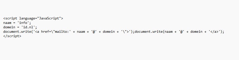 Ook zijn er andere methodes om je adres te verbergen; dergelijke aanpassingen maak je in de broncode van je website. Denk aan het omzetten van het e-mailadres naar een eenvoudige afbeelding, het @-teken vervangen door [at], de tekens vervangen door html-codering of een eenvoudig Javascript-snippet in je html-broncode zetten, zoals in onderstaande afbeelding te zien is: