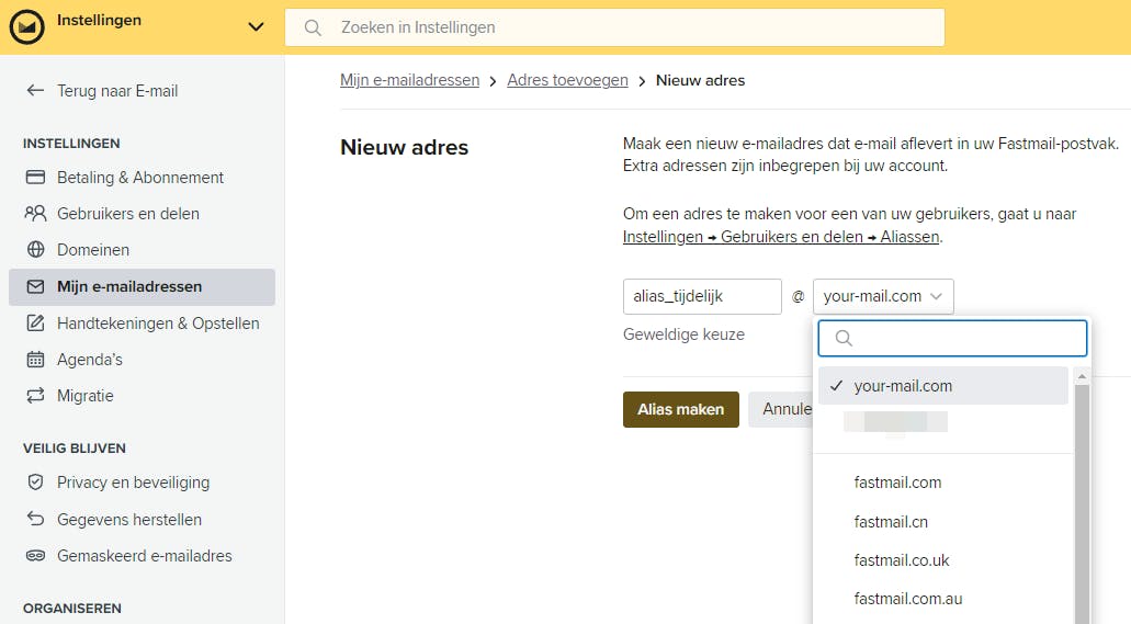 Sommige e-mailproviders bieden dergelijke diensten aan, afhankelijk van het abonnement. Zo kun je bij Fastmail (jaarlijks 50 euro + 14 euro voor een eigen domeinnaam) talloze aliassen (@<je_eigendomein>) en gemaskeerde e-mailadressen (@fastmail.com) aanmaken en verwijderen. Het is slim om te onderzoeken welke mogelijkheden jouw e-mailprovider op dit vlak biedt.
