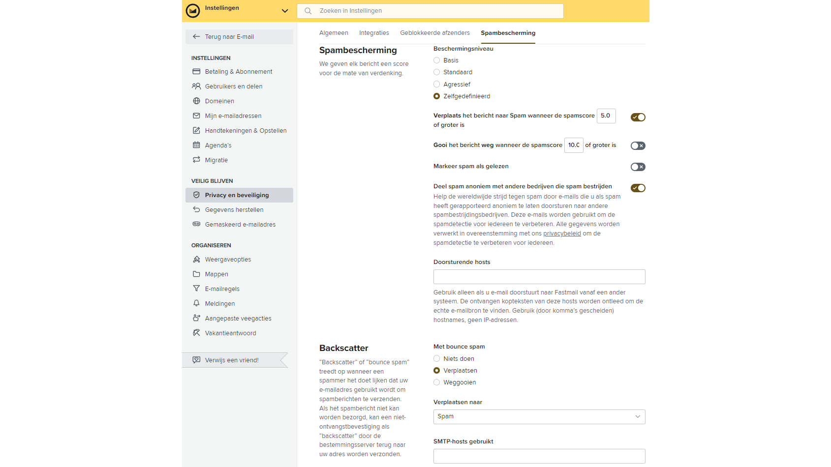 Als je e-mailadres toch in handen van spammers terecht is gekomen, kun je spamberichten verwachten. Gelukkig hebben de meeste (web)mailproviders een standaard geactiveerd spamfilter. Dit filter kun je vaak naar wens (de)activeren en instellen hoe om te gaan met verdachte berichten: blokkeren, verplaatsen naar een spammap of een label toevoegen in de onderwerpregel. Bij sommige providers, zoals Fastmail, kun je het beschermingsniveau aanpassen, zelfs tot een eigen gedefinieerd niveau met zelf ingestelde parameters. Fastmail verbetert bovendien continu zijn spamfilter op basis van jouw feedback over wat wel of geen spam is, met behulp van het populaire en opensource spamfilter Apache SpamAssassin. We raden je aan de instellingen en mogelijkheden op dit vlak bij je eigen mailprovider na te gaan.
