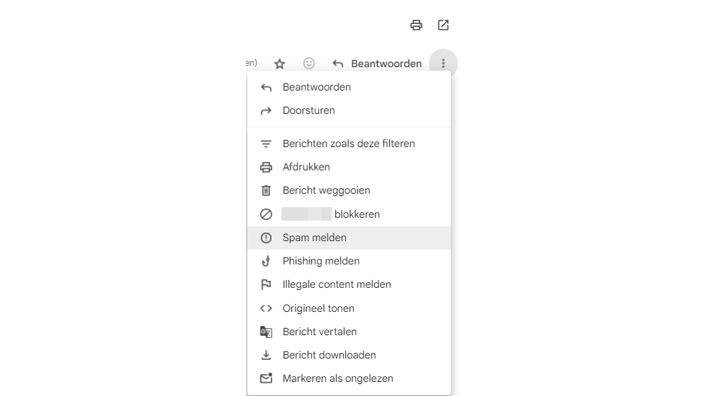 Log in en open een ongewenst bericht. Door rechts op de knop met drie puntjes te klikken, open je een menu met opties. Je kunt hier kiezen voor <afzendernaam> blokkeren, waarna toekomstige berichten van deze afzender direct naar de map Spam gaan, waar ze na dertig dagen worden verwijderd. Je kunt ook Spam melden of Phishing melden selecteren om een kopie van het bericht naar Google te sturen ter verdere analyse. Als een bericht ten onrechte als spam is gemarkeerd, klik je daar in de spammap met rechts op en selecteer je uit het contextmenu Geen spam.