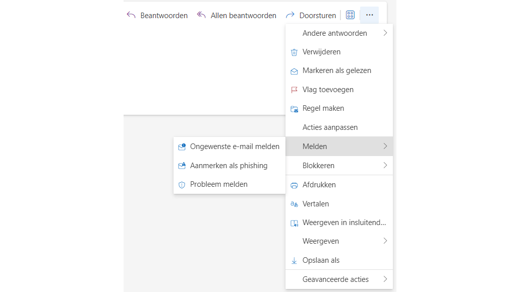 Ook de webversie van Outlook biedt functies om ongewenste e-mails te beheren. Open een spambericht en klik op de drie puntjes voor opties als Ongewenste e-mail melden, Aanmerken als phishing en Probleem melden. Door een bericht als ongewenst te markeren, verplaats je het naar de map Ongewenste e-mail, waar het na tien dagen wordt verwijderd. De andere opties sturen een kopie naar Microsoft voor analyse. Bij Probleem melden moet je een specifieke reden aangeven, zoals Seksueel ongepast of Inbreuk op auteursrecht.