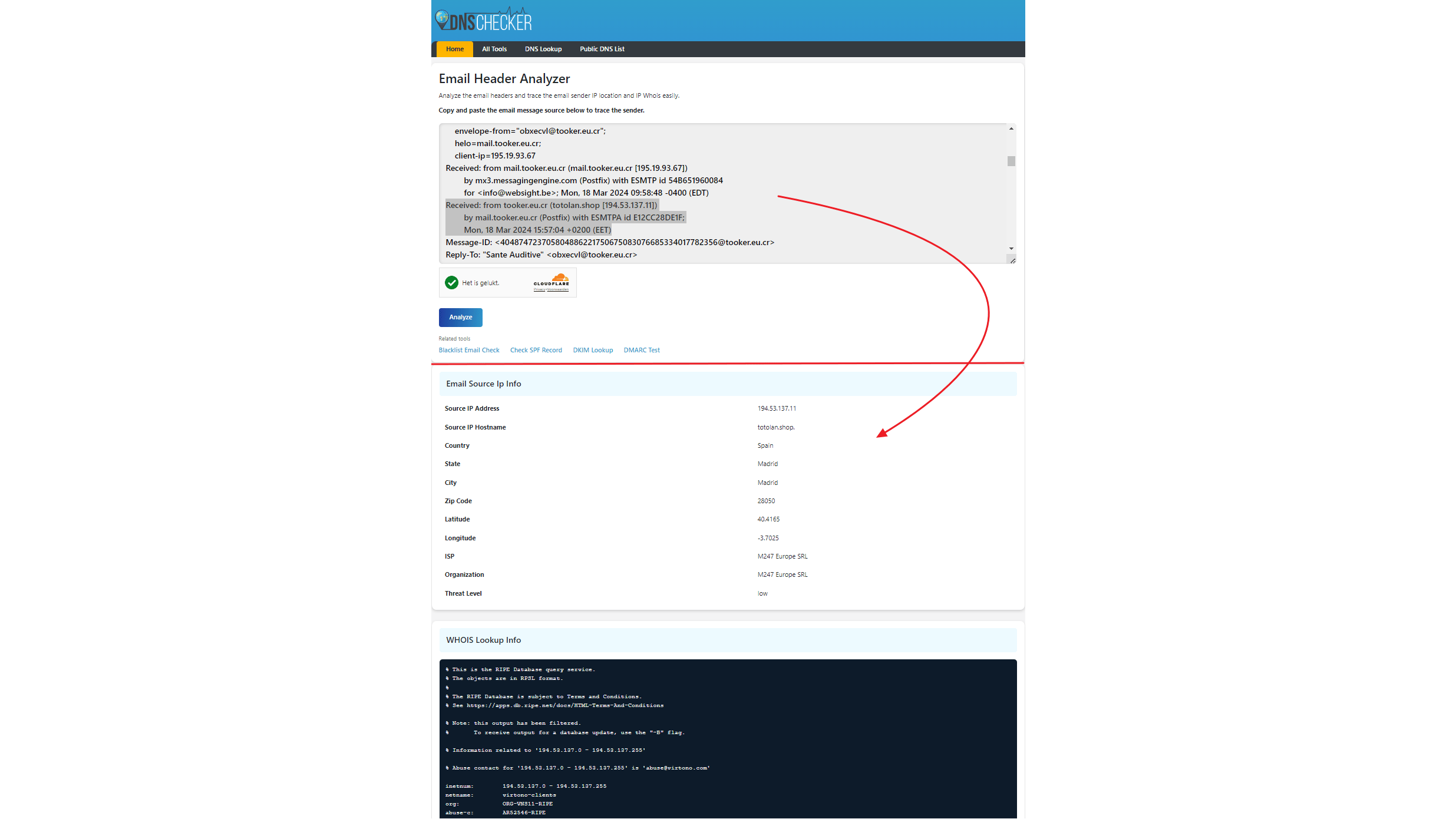 Verder zijn er online tools zoals MXToolbox, DNSChecker en Gaijin's E-Mail Header Analyzer die headers analyseren en feedback geven. Je hoeft de (complete) header alleen maar in een venster te plakken. DNSChecker voert bovendien een whois-query uit op het ip-adres, wat soms direct bruikbare contactinformatie oplevert. Door je bij Spamcop te registreren, kun je na een headeranalyse direct een spamrapport verzenden naar de betrokken servers vanwaar de ip-adressen worden misbruikt.
