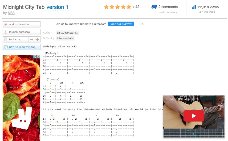 Kun je al een beetje spelen en ben je op zoek naar akkoorden, songteksten of tabs voor songs, dan heb je genoeg keuze. De websites www.chordie.com, www.azchords.com en www.ultimate-guitar.com hebben duizenden songs in de database staan. De meeste zijn door andere gebruikers geüpload en kunnen foutjes bevatten. Doordat elke song een beoordeling heeft, zie je echter meteen welke akkoordenschema’s door de community het best zijn beoordeeld en dus weinig fouten bevatten.