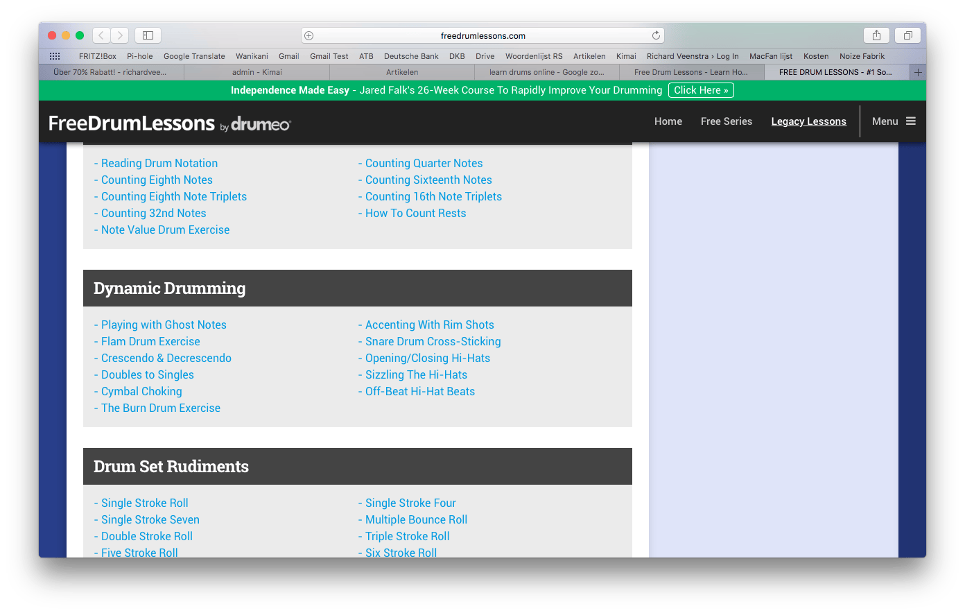 Om drums te leren spelen, kun je ook prima online beginnen. Belangrijk is dat je ritmes kunt lezen en een onafhankelijkheid in je armen en benen ontwikkelt. Voor de basics neem je een kijkje op de uitgebreide website www.freedrumlessons.com. Je vindt hier tientallen gratis lessen en video’s. Naast speeltechnieken en het lezen van drumpartituren wordt er ook op een goede houding en het juist vasthouden van je stokken gehamerd. Klik op Legacy Lessons voor de gratis lessen. De site heeft ook een nieuwere serie met geüpdatete informatie, maar voor deze serie moet je je portemonnee trekken. Ben je door de gratis informatie heen, kijk dan eens op www.drumeo.com. Hier vind je honderden video’s van gerenommeerde drummers. Een abonnement kost je zo’n 200 euro per jaar. Een fors bedrag, maar daarvoor krijg je dan ook hoogwaardige video’s met duidelijke instructies.