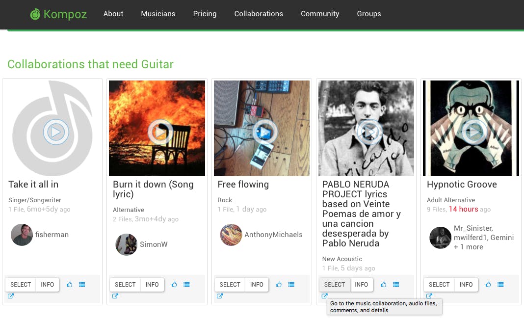 Als je je eerste piano-, gitaar- of drumlessen achter de rug hebt, wil je misschien met andere muzikanten samen werken. Een briefje bij de Albert Heijn achterlaten is natuurlijk een optie, maar er zijn slimmere opties. Op www.muzikantenbank.eu kun je een advertentie plaatsen of klikken op Advertentie zoeken. Geef aan in welke stad of regio je woont (Nederland en België) en kies of je zelf op zoek bent naar een band of ensemble of dat je iemand voor jouw band nodig hebt. Andere opties zijn www.muzikantenbank.net of de muzikanten-afdeling van Marktplaats. Wil je online met andere muzikanten samenwerken, ga dan naar www.kompoz.com en maak een gratis account aan onder Register. Je kunt een opname van jezelf uploaden en een oproep plaatsen voor een gitaarsolo, een vocale bijdrage of een mooie pianopartij voor het intro van je song. Uiteraard moet je hiervoor wel de mogelijkheid hebben om je eigen songs op te nemen.