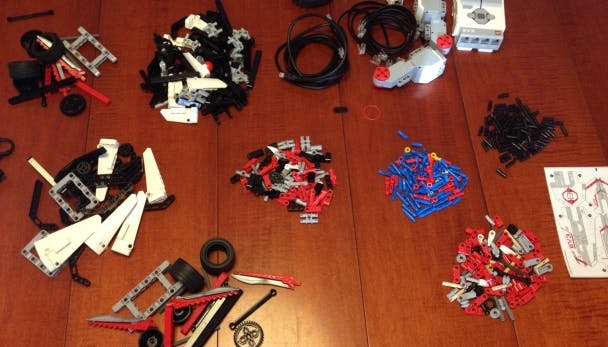 De steentjes zullen je bekend voorkomen als je wel eens met Lego Technic hebt gebouwd. Op de achtergrond zie je de sensoren en de intelligente steen.