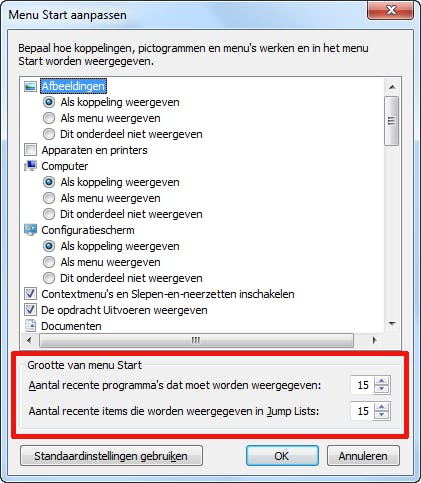 Jumplists vindt u zowel in het startmenu (klik op het pijltje achter een programmanaam) als in de taakbalk (rechtsklikken op een programma). Onder het kopje Recent staan de bestanden die u kort geleden gebruikt hebt netjes opgesomd. De lengte van deze jumplists mag u zelf instellen. Daartoe klikt u met rechts op de startknop van Windows en kiest u Eigenschappen. Op tabblad Menu Start klikt u op de knop Aanpassen. Onderin vindt u dan een kader genaamd Grootte van menu Start, waarin u bepaalt hoeveel programma’s in het startmenu en bestanden per jumplist te zien zijn.