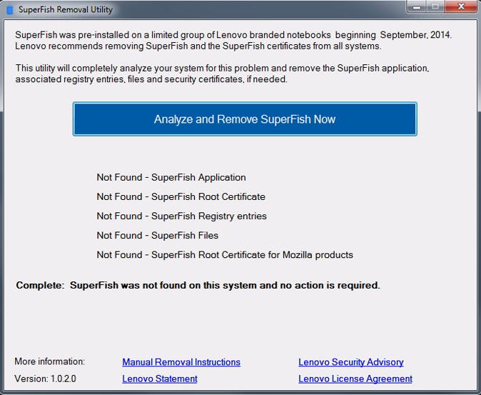 De vrijgegeven removal tool is te downloaden vanaf de website van Lenovo. Download simpelweg het bestand onder het kopje Automatic Removal Tool, installeer het bestand en klik op Analyze and Remove SuperFish Now.