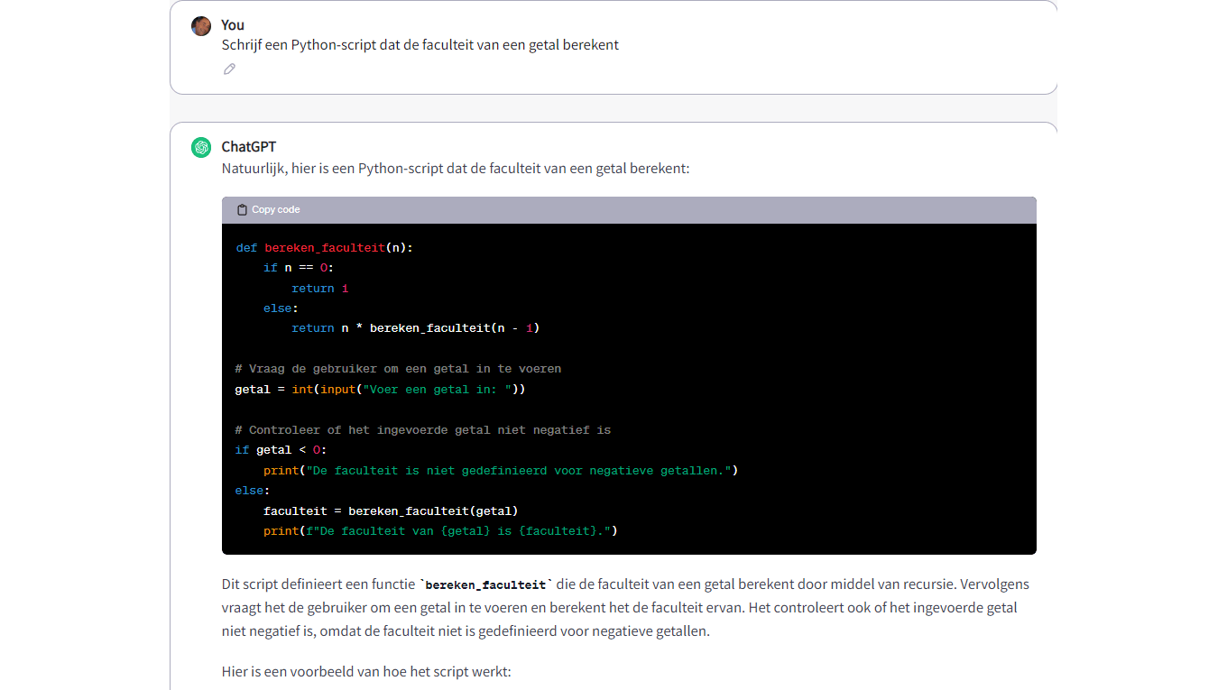 AI-code-assistenten zijn ontworpen om te integreren in een IDE (Integrated Development Environment). Als beginner ben je mogelijk nog niet vertrouwd met zo’n omgeving, maar dat betekent niet dat je AI niet kunt gebruiken voor je codeerprojecten. AI-chatbots, zoals Bard, Copilot en ChatGPT kunnen je zeker ook ondersteunen. We nemen ChatGPT als voorbeeld.