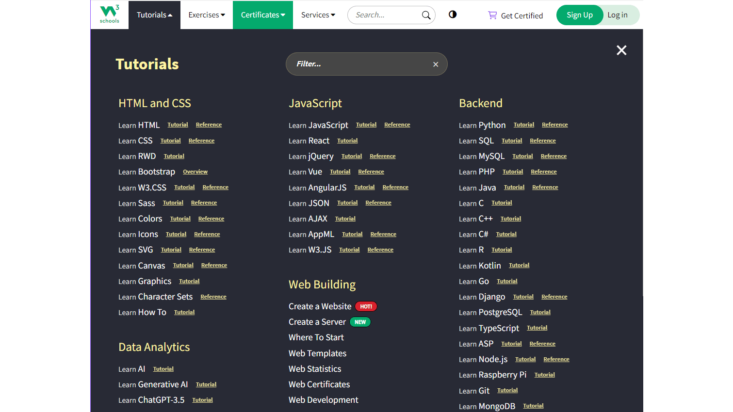 Voor wie zich vooral op webontwikkeling wil richten, is W3Schools een uitstekend startpunt. Deze website biedt een groot aantal tutorials, voorbeelden en oefeningen op het gebied van webtechnologieën. Het materiaal is gestructureerd in modules voor technologieën als HTML(5), CSS, JavaScript (inclusief frameworks zoals Angular en Node.js), XML, JSON en serverside-technologieën als PHP en ASP.NET. Je kunt voorbeelden interactief uitproberen op de site. De inhoud is vrij toegankelijk en wordt regelmatig bijgewerkt. Ook kun je je eigen code en webpagina’s gratis opslaan in ‘W3Schools spaces’ en delen met anderen. Voor betaalde certificaten die je kennis aantonen, kun je ook bij W3Schools terecht.