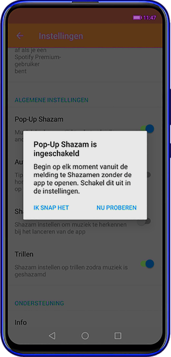 Als je een filmpje op je telefoon bekijkt, dan kun je ook die achtergrondmuziek in Shazam laten herkennen. Op die manier krijg je de songtekst te lezen. Je moet die functie wel activeren. In iOS werkt dit via de knop Muziekherkenning die je hebt toegevoegd aan het bedieningspaneel. In Android werkt dit via Pop-up Shazam. Open de Shazam-app, veeg naar de bibliotheek en tik op de knop Instellingen. Schakel Shazamen vanuit pop-up in; tik op Ga naar instellingen; tik op Shazam en schakel Allow display over other apps (Weergave vóór andere apps toestaan) in. Vanaf dan kun je de muziek uit een andere app laten herkennen via de knop.
