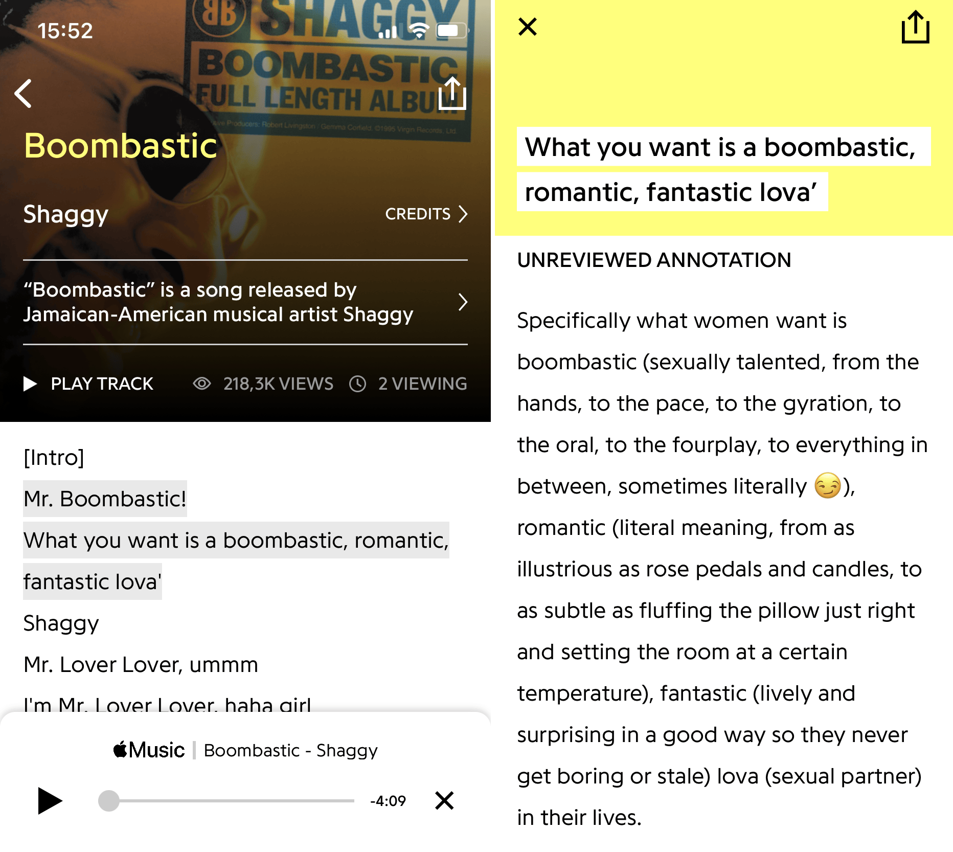 Genius: Song Lyrics Finder profileert zich als dé gratis app voor Android en iOS om de lyrics en de betekenis ervan te vinden. Open de app en tik op de muziekherkenningsknop in de rechterbenedenhoek. Genius ondersteunt ook contextaanmerkingen. Die worden gemarkeerd in de tekst. Als je daarop tikt, lees je de context van deze tekstlijn. Hierdoor weten we eindelijk wat Shaggy bedoelt met 'Mr. Boombastic' en weten we waar Tina Turners 'Nutbush' ligt. Daarnaast toont de app een lijst met de meest geïdentificeerde nummers op Genius. Je kunt op elk van deze nummers tikken om de songteksten te lezen en de liedjes af te spelen. Het is zelfs mogelijk de songtekst te downloaden of het nummer met anderen te delen. Helaas bevat de app veel reclame.