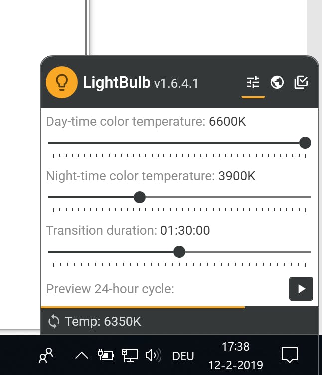 Na de installatie vind je het programma in de taakbalk onderin. Klik erop en je ziet een aantal schuiven. De bovenste is de kleurtemperatuur van je beeldscherm tijdens de dag, de tweede schuif is de kleurtemperatuur voor de nachtelijke uren. Kleurtemperatuur wordt in kelvin uitgedrukt, een kleur boven de 5000 K wordt als blauw en koel ervaren. Des te lager het aantal kelvin, des te warmer. Het blauwe licht dat een beeldscherm uitstraalt, zorgt ervoor dat je brein minder melatonine afgeeft. Minder melatonine betekent dat je je natuurlijke slaapritme uitstelt. Om beter te kunnen slapen, is het dus handiger dat je pc je hierop voorbereidt door je beeldscherm warmer te laten lijken naarmate het later wordt.