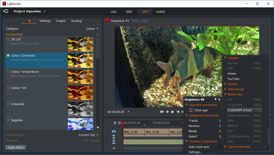 Het aantal zichtbare montagegereedschappen valt erg mee. Met blauwe markers stel je een begin- en eindpunt in, waarna je het geselecteerde fragment wist of ergens anders in de film laat tergkomen (knippen). Mits er een microfoon is aangesloten, spreek je desgewenst een audioboodschap in. Veel meer functies laat het bewerkingsvenster niet zien. Gelukkig ontdekken we in het contextmenu onder de rechtermuisknop nog wat gereedschappen. Zo stel je bijvoorbeeld een vertraging in en voeg je overgangen toe. Tot slot tref je onder de tabbladen VFX en Audio nog diverse effecten en een audiomixer aan. Met de gratis versie sla je video’s uitsluitend als mp4-bestand op (h.264-codec). Bovendien is de resolutie beperkt tot 720p.