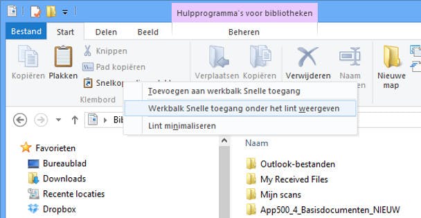 Dat minimalistische vind je in de werkbalk Snelle toegang. Je vindt deze werkbalk bovenin ieder Windows Verkenner-venster, (boven Bestand, Start, Delen, enzovoort), door op het zwarte pijltje naar beneden te klikken. In deze werkbalk kun je beknopt aangeven welke opties je daarin wilt zien en welke niet. Klik nu met de rechtermuisknop op een willekeurige plek in het Lint en vervolgens op Werkbalk Snelle toegang onder het Lint weergeven. De werkbalk verdwijnt nu van de bovenkant van het venster en wordt onder het Lint geplaatst.