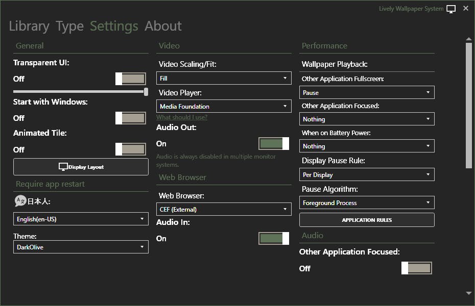 In het tabblad Settings kun je aangeven wanneer Lively het afspelen van de achtergrondvideo moet pauzeren. Bijvoorbeeld wanneer je een venster van een applicatie in full-screen zet. Op die manier bespaar je op cpu-belasting. Nieuw achtergrondmateriaal voeg je via drag-and-drop toe.