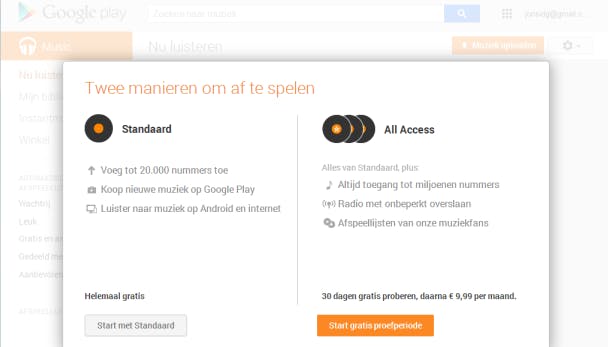 Het grote voordeel van Google Play Music is dat je je mp3-collectie (max 25.000 nummers) kunt uploaden naar de Google-servers, waarna je je muziek vervolgens gratis kunt streamen naar de app (Android, iOS) of in de browser. Je kunt losse nummers aanschaffen en je kunt de dienst uitbreiden met een All Acces-account voor een tientje per maand.