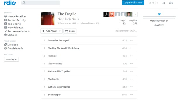 Het grote voordeel? De interface is vooral in de browser erg mooi vormgegeven. Nadeel is wel dat de bitrate op 192 kbit/s blijft steken. Rdio bestaat in vier varianten, Web (4,99 euro, browser en pc), Onbeperkt (9,99 euro, inclusief gebruik apps), Onbeperkt familie (17,99 euro, twee streams tegelijk mogelijk) en een gratis probeerversie van 14 dagen.