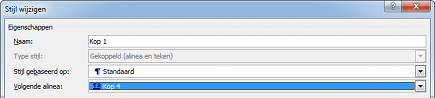 Erg belangrijk aan een stijl is de invloed die hij heeft op de alinea die erna komt. Een stijl geldt immers alleen voor één alinea, maar welke opmaak krijgt de volgende alinea dan? Dit wordt bepaald door een van de opties of kenmerken van een stijl. Open de opmaak van een stijl, door met de rechtermuisknop op de naam van de stijl te klikken en te kiezen voor Wijzigen. De vierde optie die u ziet is Volgende alinea, en hiermee bepaalt u welke stijl wordt toegepast op de alinea die volgt op de alinea met het betreffende profiel. Dit is belangrijk wanneer u een bepaalde standaardstijl gebruikt.