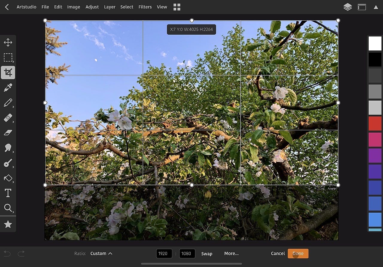 Start je fotobewerker en open een foto die je als bureaublad-achtergrond wilt gebruiken. Klik dan op het bijsnijdgereedschap van je fotobewerker. In meeste van dit soort programma’s kun je bij deze tool de gewenste beeldverhouding opgeven. In bijvoorbeeld Artstudio Pro en Photoshop kan dat heel makkelijk door gewoon de gevonden getallen van de horizontale en verticale resolutie in te vullen. Ofwel: heb je een beeldscherm met een resolutie van 1920 x 1080 (full HD) dan vul je simpelweg die waarden in in het bijsnijdgereedschap. Oudere en vaak net wat minder flexibele beeldbewerkers kunnen alleen overweg met een setje standaardwaarden. Daarbij is het goed om in het achterhoofd te houden dat een Full HD-scherm (meest gangbaar anno nu) een beeldverhouding heeft van 16:9. Een antieke resolutie – vroeger heel gangbaar – is 1024 x 768, wat gelijk staat aan een beeldverhouding van 4:3. Foto’s gemaakt met een compact-camera zijn veelal opgeslagen in die 4:3-beeldverhouding; foto’s gemaakt met een spiegelreflex of systeemcamera in 3:2-verhouding. Kortom: meestal zal er wat uitgesneden moeten worden.