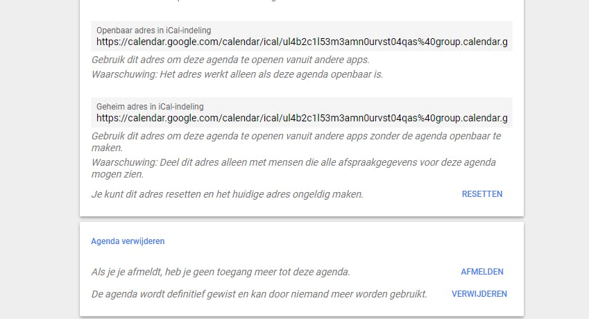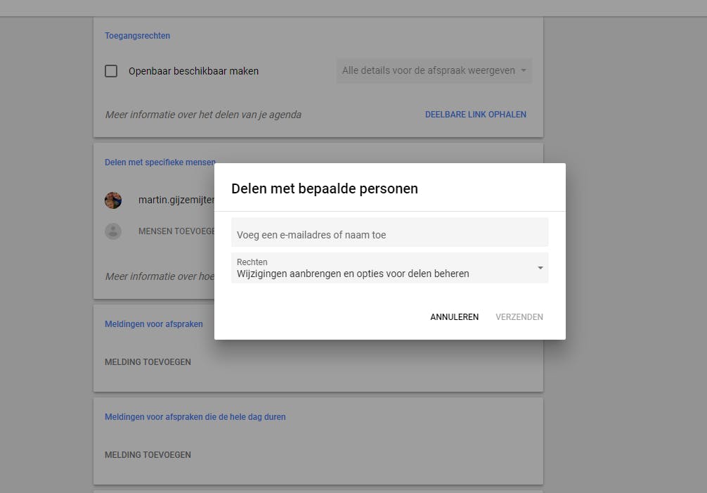 Wanneer je bij het delen een Gmail-adres hebt ingevuld, dan krijgt de persoon in kwestie een e-mail met daarin een notificatie van het feit dat jij hem of haar hebt uitgenodigd voor een gedeelde agenda. Wat zowel handig als een beetje dubieus is, is dat je niet de keuze krijgt om de gedeelde agenda te weigeren … hij wordt automatisch toegevoegd onder het kopje Mijn agenda’s. Mocht iemand je onverhoopt hebben toegevoegd aan een agenda waar je geen onderdeel van wilt uitmaken, dan kun je klikken op het pijltje naar beneden naast de betreffende agenda en vervolgens op Instellingen en delen. Vervolgens kun je helemaal onderin kiezen voor Afmelden (als je je alleen wilt afmelden) of – als je die rechten hebt – Verwijderen als je wilt dat die voor niemand meer beschikbaar is. De agenda verdwijnt dan direct uit het overzicht.