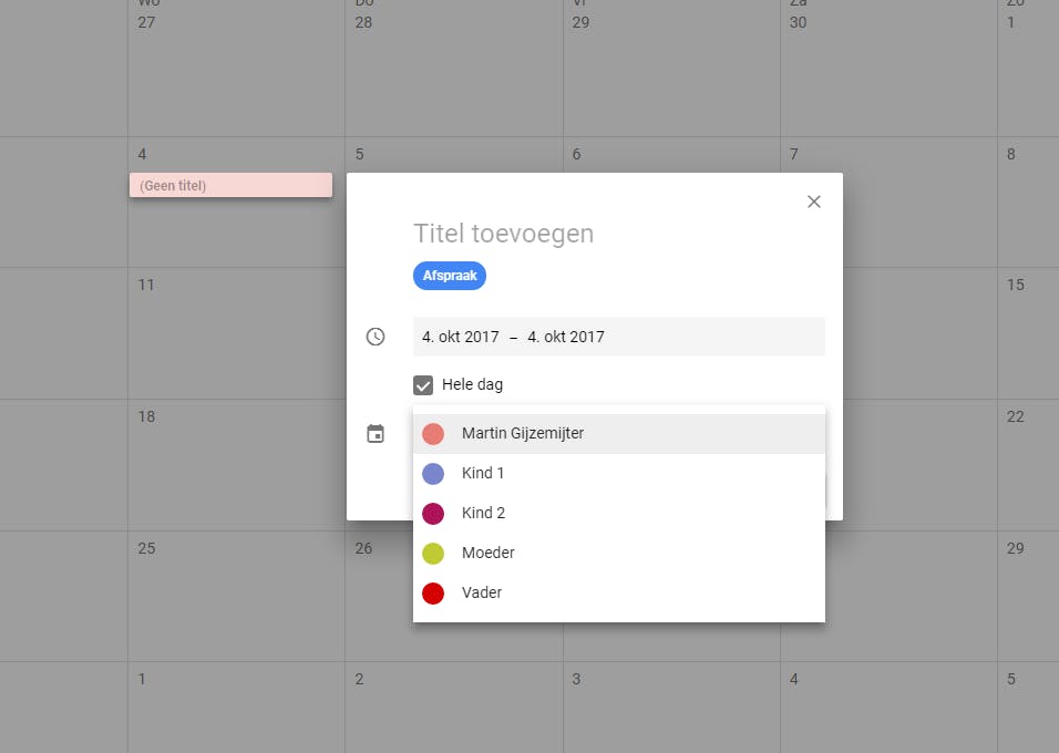 Nu je de agenda hebt aangemaakt en gedeeld met iedereen die daar toegang tot zou moeten hebben, wordt het tijd om een afspraak in te plannen. Hoe je dat doet is heel belangrijk, want het is niet zo dat elke afspraak die je inplant automatisch met alle agenda’s gedeeld wordt. Open je Google Agenda en klik op de dag/het tijdstip waarop je een afspraak wilt inplannen. Geef de afspraak een naam en klik vervolgens op Meer opties om meer gegevens toe te voegen of aan te passen. Zo kun je aangeven dat de afspraak de hele dag duurt, waar hij plaatsvindt, kun je een bijlage toevoegen enzovoort. Maar het belangrijkste in dit geval is dat je de afspraak toewijst aan de juiste agenda. In ons voorbeeld hebben we een agenda aangemaakt voor alle leden van het gezien (voor het gemak even vader, moeder, kind 1 en kind 2 genoemd). Als je de agenda van kind 2 met kind 2 hebt gedeeld en de agenda van kind 1 niet (wat logisch is, want kind 2 heeft niet zoveel te maken met de voetbaltraining van kind 1), dan krijgt kind 2 dus alléén de afspraken te zien die je toewijst aan de agenda van kind 2.