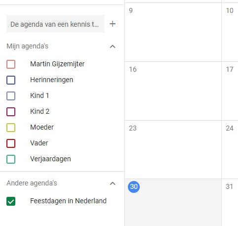 Aan het begin van dit artikel hebben we aangegeven dat het niet handig is om je hoofdagenda te gebruiken voor het inplannen van allerlei familiezaken (tenzij je verder zelf helemaal niets doet met die agenda natuurlijk). Of je nu een agenda hebt aangemaakt voor ieder gezinslid zoals wij, of een agenda voor het gezin als geheel … je agenda zal vrij snel vollopen met afspraken. Dat kan erg onoverzichtelijk worden, zeker wanneer er afspraken overlappen. Normaal is overlap een slechte zaak, maar als bijvoorbeeld je vrouw met de kinderen naar voetbaltraining gaat, terwijl jij een belangrijke deadline hebt staan, dan is de overlap geen enkel probleem. Verschillende mensen, verschillende afspraken. Maar het is dan wel fijn als je de weergave van de agenda even uit kunt zetten. Zo word je niet afgeleid door andere afspraken, terwijl je er nog wel een notificatie van krijgt. Dit kan heel eenvoudig door in Google Agenda links onderin op het gekleurde vierkantje voor de agenda’s te klikken die je niet wilt weergeven. Als het vakje niet met een kleur gevuld is, worden afspraken in die agenda niet getoond in je hoofdoverzicht. Zo kun je dus heel eenvoudig overzicht aanbrengen, en ook heel specifiek afspraken per persoon bekijken als je iedereen een eigen agenda hebt gegeven.