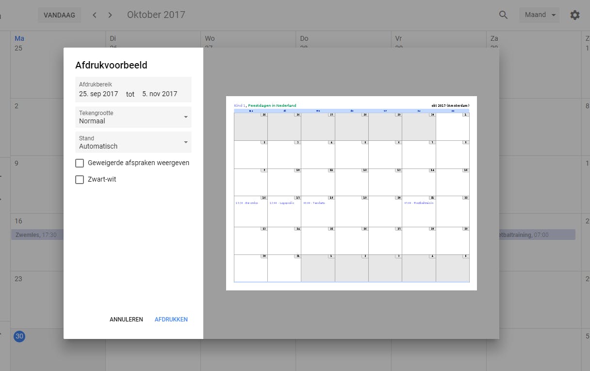 Maak een gezinsagenda of een agenda per kind aan, zoals we in stap 1 hebben uitgelegd. Vervolgens voeg je als ouder de afspraken van de komende maand toe aan de juiste agenda. Stel nu dat je een overzicht wilt maken voor kind 1. Zorg dan dat onder Mijn agenda’s alleen Kind 1 is geactiveerd en kies voor Maand in de weergave rechtsboven. Klik daarna op het pictogram met het tandwiel en op Afdrukken in het menu dat uitklapt. Er wordt nu een agenda afgedrukt met daarin de afspraken van de betreffende persoon. Bij wijzigingen kun je die afspraken handmatig toevoegen. Hang de agenda aan het prikbord of deur van Kind 1, en iedereen weet waar hij aan toe is.