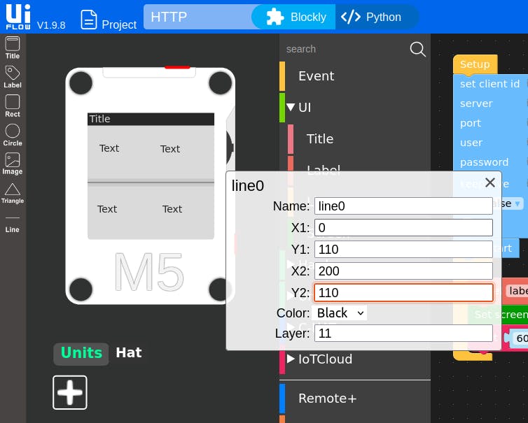 We zijn begonnen met één label, maar we willen uiteraard meerdere sensorwaardes tonen. Gelukkig kun je de interface eenvoudig uitbreiden. Sleep uit de linkerzijbalk een Title, drie keer een Label en één keer een Line naar het scherm van de Core Ink. Je hebt nu vier labels: twee voor sensorwaardes en twee voor een begeleidende tekst. Met de lijn delen we het scherm op in twee vakken.
