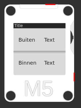 Klik op elk van de labels om hun eigenschappen aan te passen. Het label linksboven geef je de tekst Buiten en lettertype DejaVuSans 18. Het label rechtsboven geef je hetzelfde lettertype. Het label linksonder geef je de tekst Binnen en ook hetzelfde lettertype. Dit lettertype ken je ook aan het label rechtsonder toe. De tekst van de labels rechtsboven en rechtsonder maakt niet uit: die gaat ons programma vervangen door de sensorwaardes. Ook bij de titel laten we de tekst door het programma aanpassen.