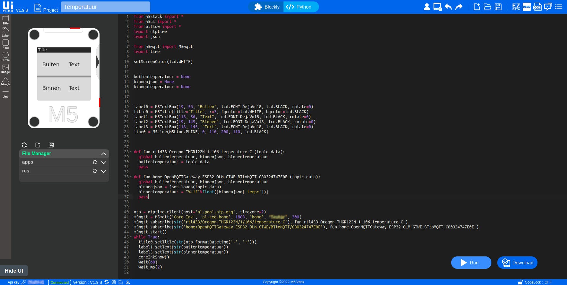 Ook krachtig aan UIFlow is dat je Blockly-code onderliggend in MicroPython wordt omgezet, een lichtgewichtversie van de programmeertaal Python voor microcontrollers. Als je bovenaan op Python klikt, krijg je de MicroPython-code te zien die overeenkomt met je blokkenconstructie in Blockly. Klik je daarna op Blockly, dan krijg je weer je blokken te zien.