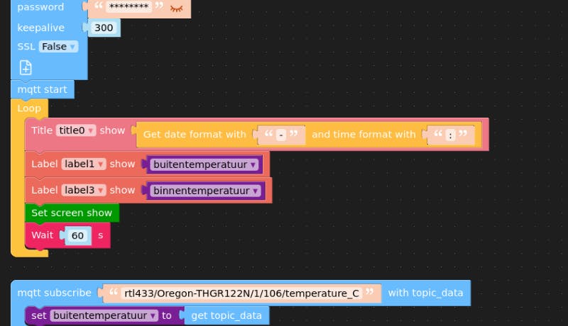 Dan rest ons nu nog om de temperatuur te tonen in een label. Omdat we met een e-ink-scherm werken mogen we het scherm niet te snel na elkaar verversen. Dat is de reden waarom we niet in het blok mqtt subscribe onmiddellijk de temperatuur op het scherm tonen, want sommige sensoren sturen elke seconde een nieuwe waarde via MQTT.