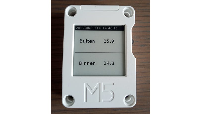 Als je nu nog de buitentemperatuur op het juiste label toont en deze code op je Core Ink draait, krijg je in de titelbalk de huidige datum en tijd te zien, en in het bovenste gedeelte de buitentemperatuur. Nu kunnen we in het onderste gedeelte nog een andere temperatuur tonen als we daarvoor een extra variabele aanmaken die we in een ander mqtt-subscribe-blok een waarde geven. Dat blok kan ook complexer zijn, bijvoorbeeld als de MQTT-boodschap in JSON-formaat is (zie ook het kader ‘JSON’).