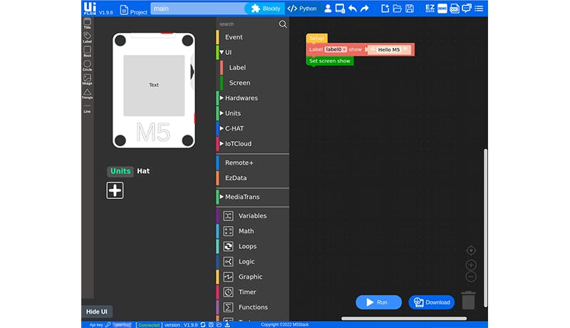 Als eerste test kun je een tekst op het scherm van je Core Ink tonen. Sleep uit de zijbalk helemaal links een Label naar het midden van het scherm van je Core Ink. Klik in het midden op UI, op Label en dan op Label label0 show "Hello M5". Dat blokje verschijnt dan op het canvas rechts. Klik het vast onder het blokje Setup. Klik dan onder UI op Screen, vervolgens op Set screen show en klik dit vast onder het vorige blokje. Klik dan helemaal onderaan op Run. Je code wordt nu op de Core Ink uitgevoerd.