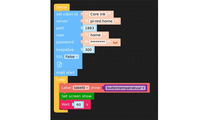 Daarom maken we een lus aan die elke minuut het label aanpast. Sleep de lus uit Event / Loop achter mqtt start en verwijder het blokje Set screen show dat er eerst stond. Voeg in de lus het blokje UI / Label / Label show toe. Vervang het blokje met de standaardtekst "Hello M5" door het blokje Variables / buitentemperatuur. Voeg dan het blokje Screen / Set screen show onder het label toe en daaronder Timer / Wait 1 s. Vervang de 1 door 60 voor een update elke minuut.
