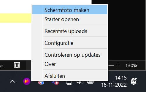 Via het pictogram in het systeemvak heb je toegang tot aanvullende opties. Zo ondersteunt Flameshot ook een timer, zoals je mogelijk gewend bent van de ingebouwde screenshotfunctie van Windows. Klik met de rechtermuisknop op het pictogram van Flameshot en kies Starter openen. Bij Gebied geef je aan op welke manier de schermafbeelding moet worden gemaakt (bijvoorbeeld Volledig scherm). Geef hierna bij Wachttijd aan na hoeveel tijd een foto mag worden gemaakt (bijvoorbeeld 10 seconden). Bevestig met een klik op Nieuwe schermfoto maken.