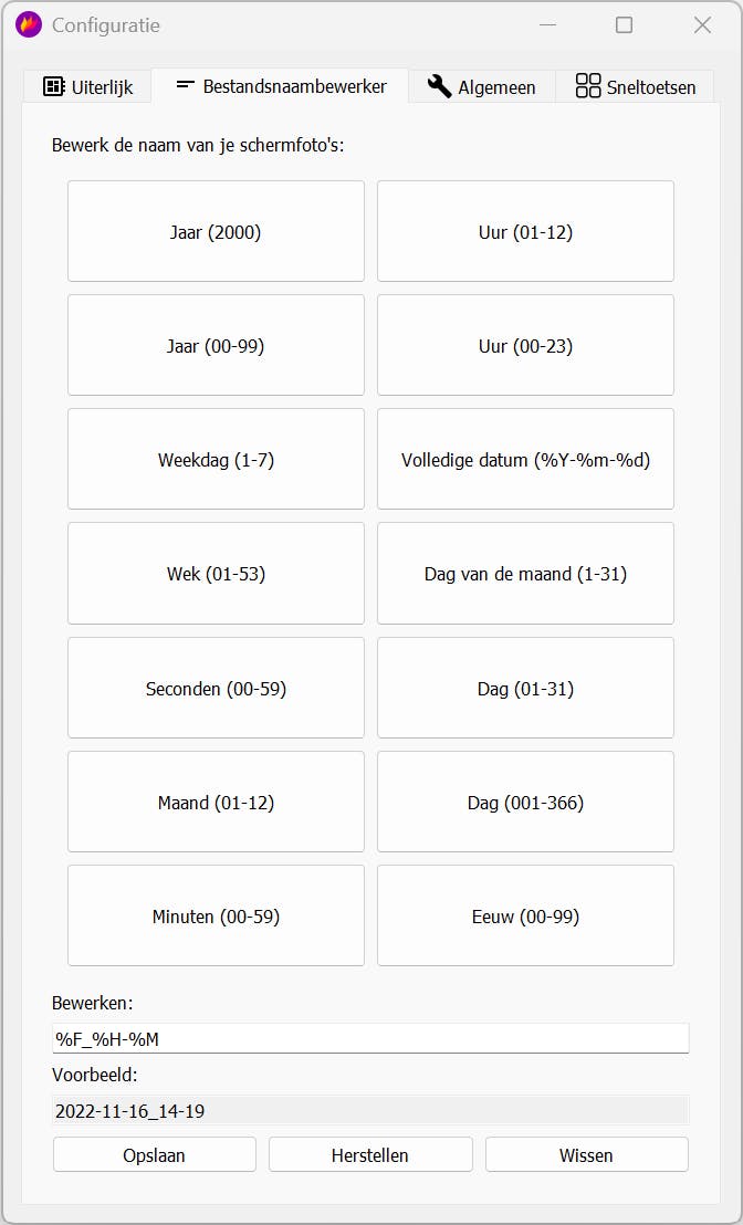Klik met de rechtermuisknop op het pictogram van Flameshot en kies Configuratie. Het instellingenvenster bestaat uit een viertal tabbladen. Op de tab Uiterlijk geef je bij Knopselectie aan welke knoppen standaard moeten worden getoond. Verwijder het vinkje naast de knoppen die je niet wilt zien. Klik hierna door naar de tab Bestandsnaambewerker. Hier bepaal je de standaardopbouw van de bestandsnaam. Je geeft bijvoorbeeld aan dat er altijd een jaartal in de bestandsnaam moet worden opgenomen of dat de tijd volledig moet worden uitgeschreven. In het vak Voorbeeld controleer je of de naamopbouw correct is.