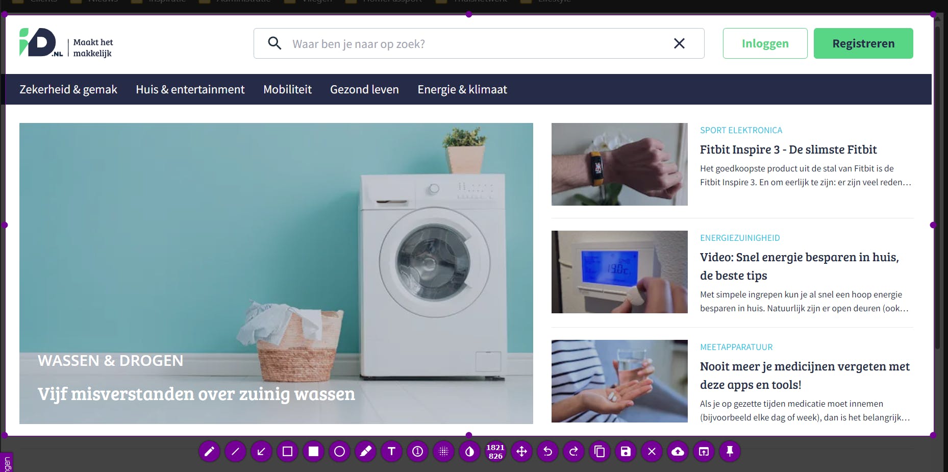Wil je meer dan alleen een screenshot maken? Rondom het screenshot toont Flameshot alle opties, in de vorm van compacte knoppen. In de praktijk gebruik je de knoppen om te tekenen waarschijnlijk het meest. Deze worden ‘vooraan’ de opties getoond. Zo vinden we hier onder andere een knop om de aanwijzer in een pen te veranderen, een knop om de aanwijzer in een pijl te veranderen en knoppen waarmee je vormen kunt tekenen (zoals cirkels en vierkanten). Via de knop Voeg tekst toe aan je schermfoto (herkenbaar aan de letter T) kun je aantekeningen op de schermafbeelding maken.