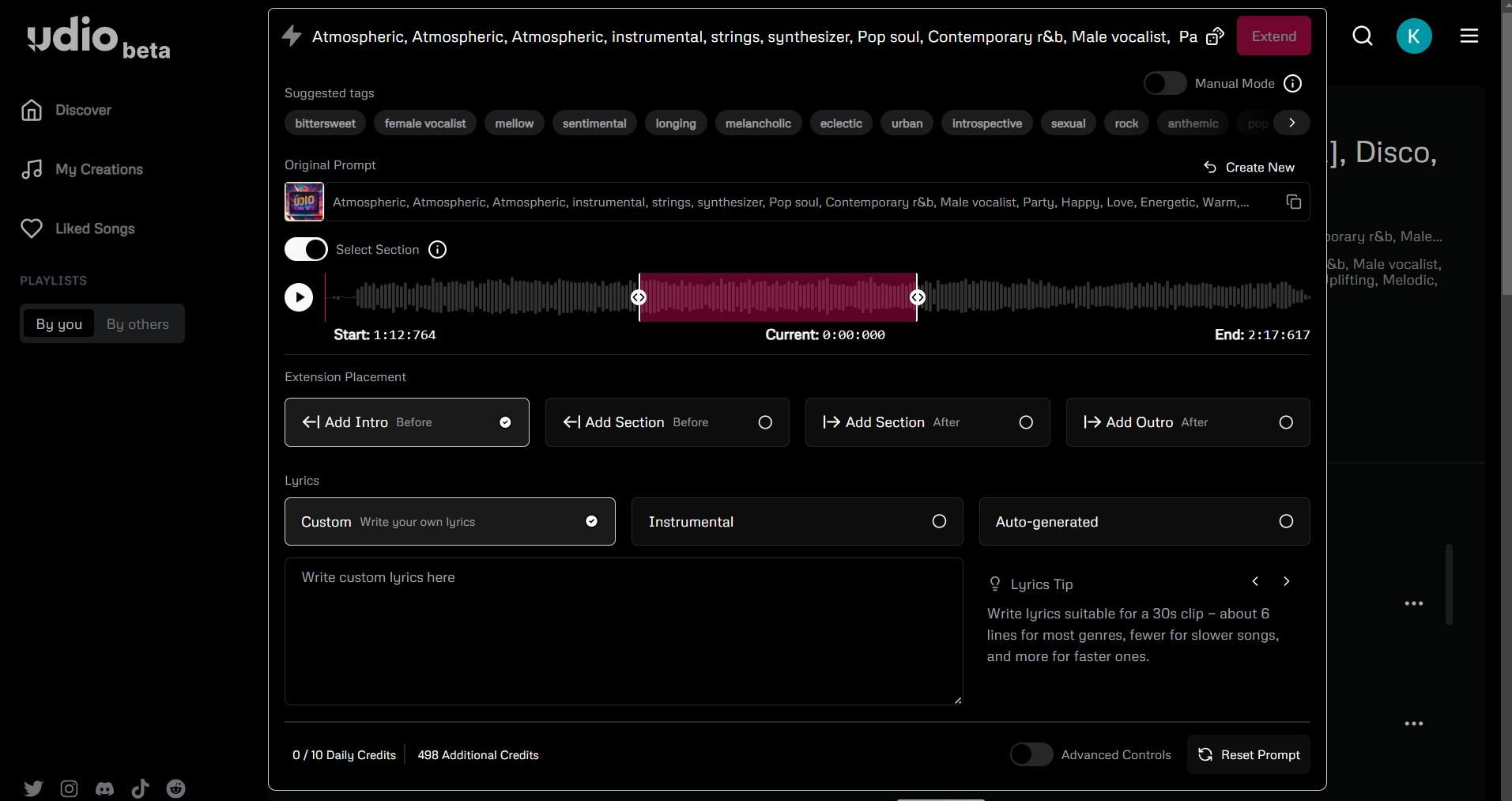 Udio geeft je wel meer opties bij het verlengen van nummers. Je kunt er in tegenstelling tot Suno namelijk voor kiezen of je een nieuw deel vóór of na de reeds gegenereerde audiostukken wilt plakken. Bij Udio kun je ook precies aangeven welk gedeelte van de gegenereerde audio je wilt gebruiken voor het volgende deel van het nummer. Als je ontevreden bent over het begin en eind van de song, kun je er bijvoorbeeld voor kiezen om alleen het middenstuk te bewaren en voor het eerste en laatste stuk nieuwe audio te genereren. Deze opties heb je bij Suno allemaal niet. In Suno kun je alleen in chronologische volgorde delen aan het nummer toevoegen.