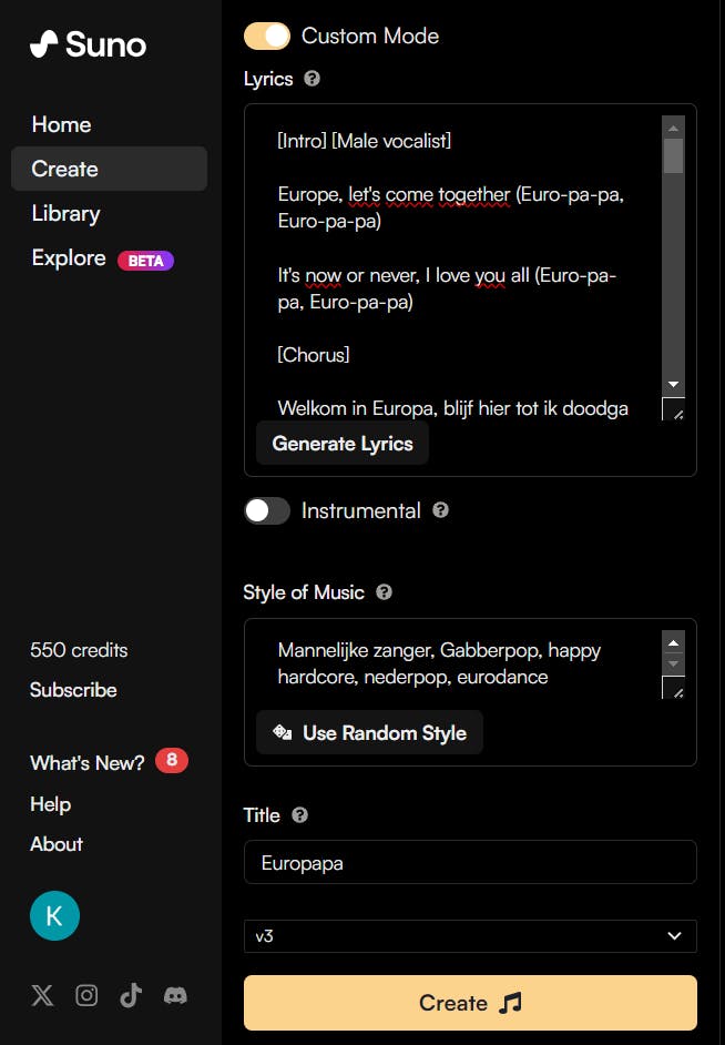 We kunnen ons voorstellen dat het lastig is om zelf 'out of the blue' aan de slag te gaan, dus we hebben hieronder een uitgebreide voorbeeldprompt voor je uitgeschreven met een actueel tintje. Als je in Suno eenmaal een account hebt aangemaakt, kies je in het menu linksboven eerst voor Create en zet je het schuifje op Custom Mode. Daarna verschijnt er een extra venstertje met de naam Lyrics waarin je onderstaande songtekst met instructies kunt plaatsen.