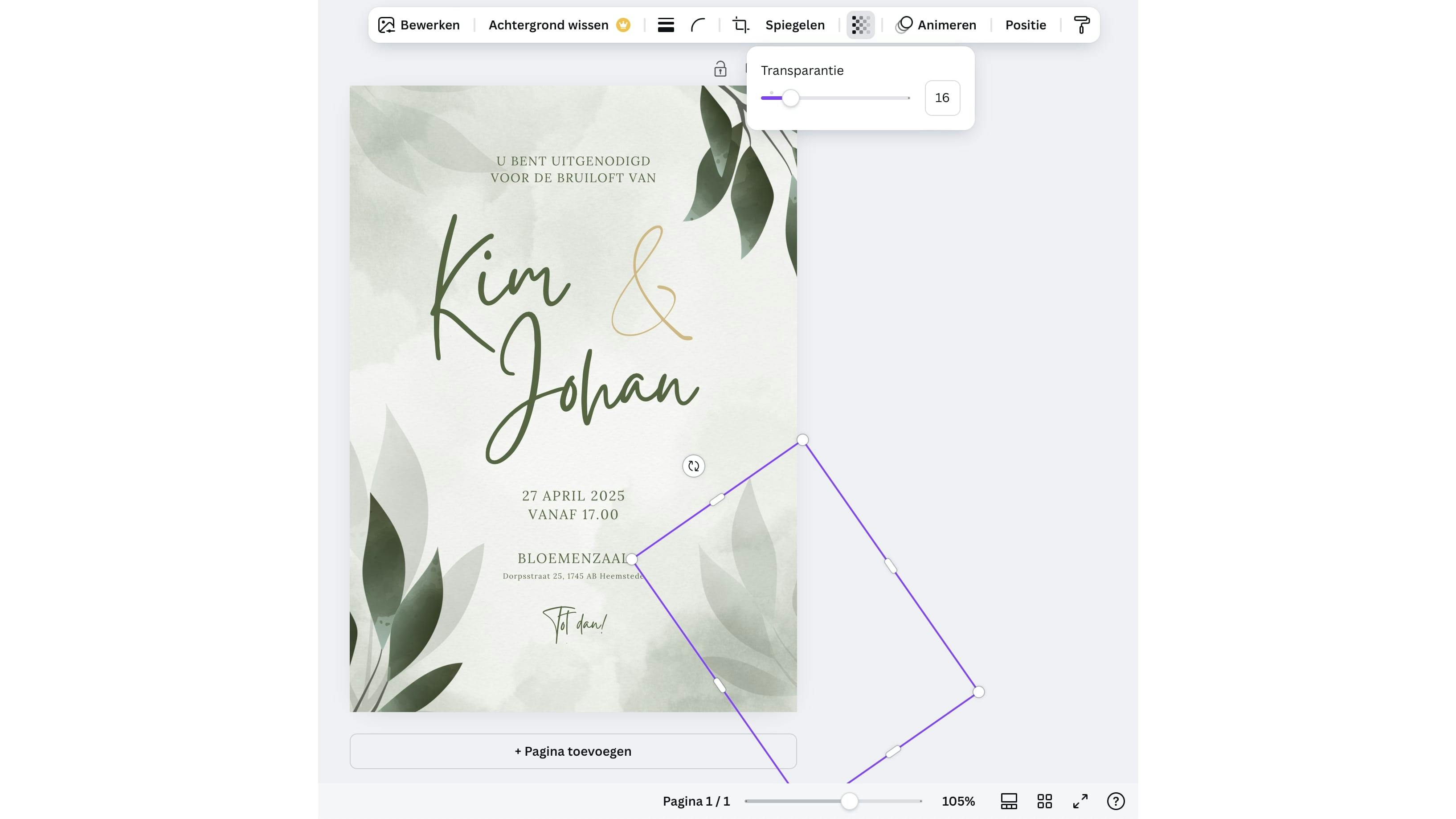Als je design-elementen van een sjabloon wilt veranderen, dan werkt dit in principe op dezelfde manier als een tekstvak; je hebt alleen een paar andere menu-onderdelen tot je beschikking. Elk element is te selecteren zodra je er met je cursor overheen beweegt, tenzij een element is vergrendeld. Sommige ontwerpen maken gebruik van afbeeldingen of vormen die meerdere keren zijn gekopieerd, maar met een verschillende mate van doorzichtigheid. Klik op een element en druk vervolgens op het transparantie-pictogram. Met de schuif eronder bepaal je de mate van doorzichtigheid. Met de knop ernaast spiegel je een element horizontaal of verticaal. Wil je een element draaien, dan selecteer je het en kies je voor de draaiknop die naast het element verschijnt.